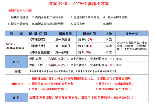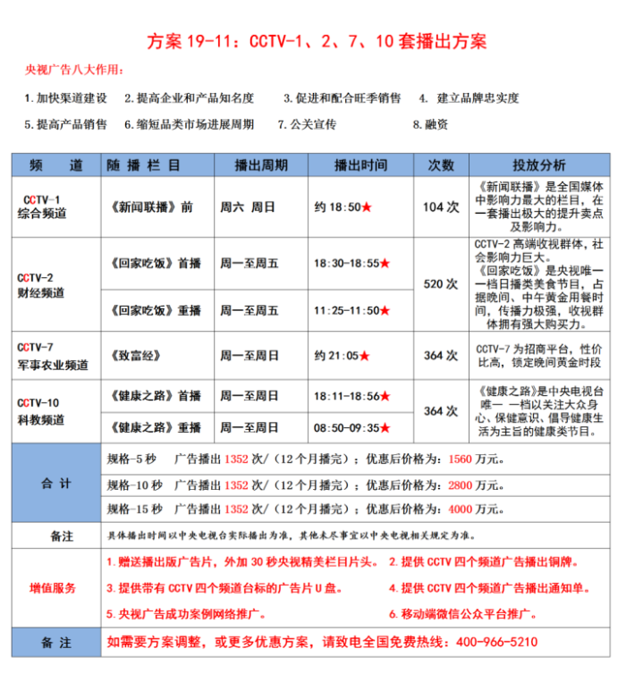 方案18-11:CCTV-1、2、7、10套播出方案【希望国际广告】央视一级金牌代理公司,集中央台各频道优势资源。详情致电:138-1030-5587 400-966-5210