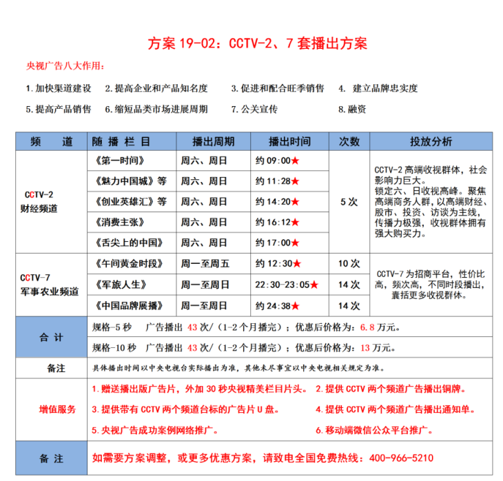 方案18-02:CCTV-2、7套播出方案【希望国际广告】央视一级金牌代理公司,集中央台各频道优势资源。详情致电:138-1030-5587 400-966-5210