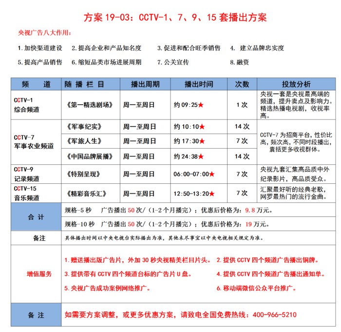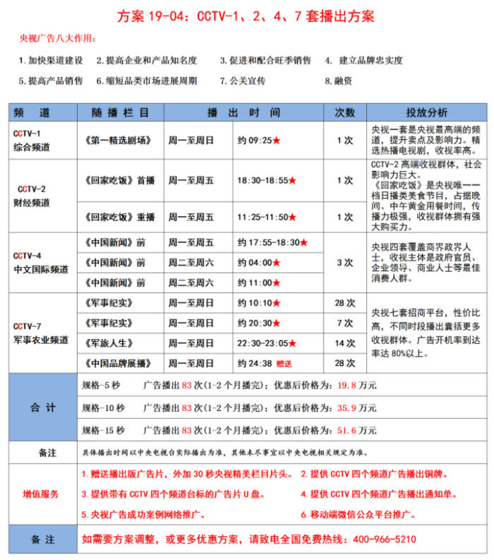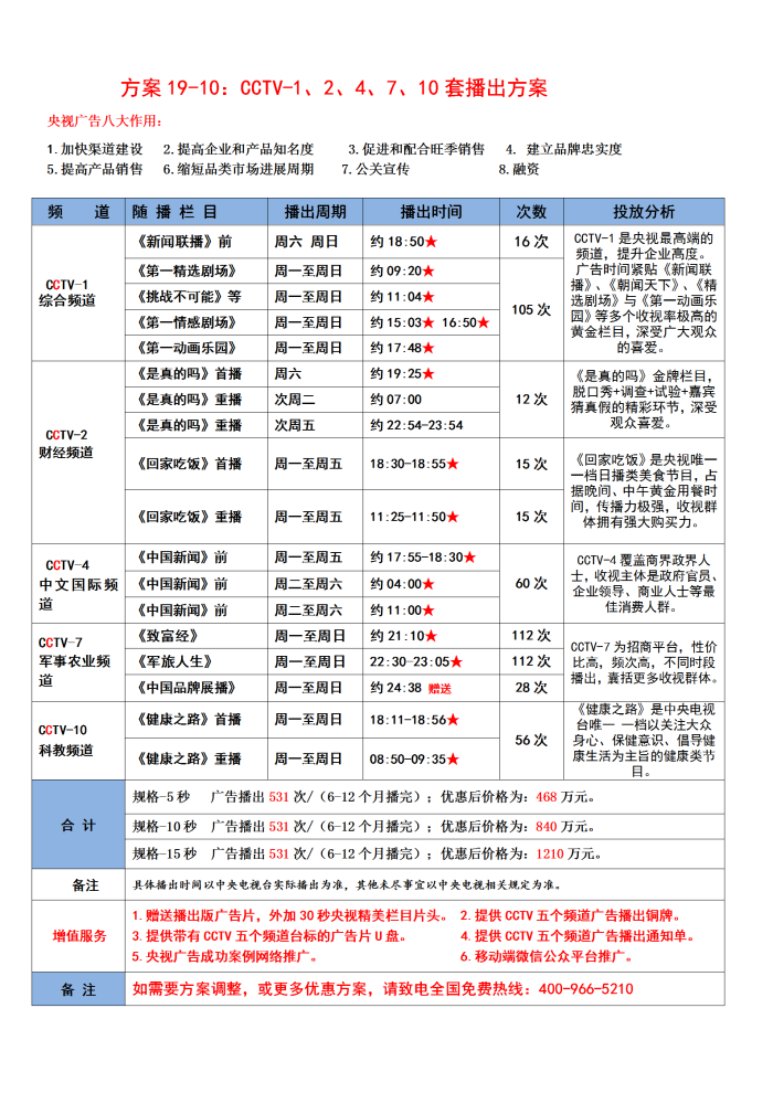 方案18-10:CCTV-1、2、4、7、10套播出方案【希望国际广告】央视一级金牌代理公司,集中央台各频道优势资源。详情致电:138-1030-5587 400-966-5210
