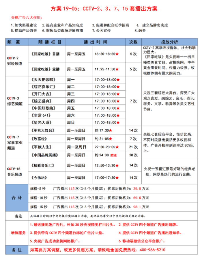 方案18-05:CCTV-2、3、7、14套播出方案 【希望国际广告】央视一级金牌代理公司,集中央台各频道优势资源。详情致电:138-1030-5587 400-966-5210