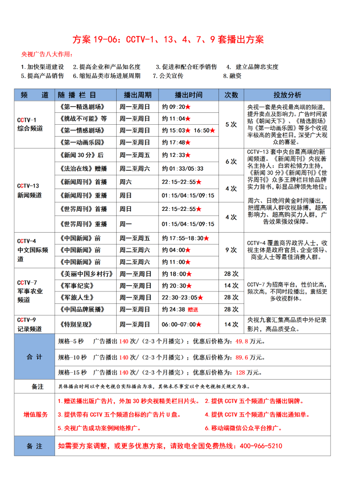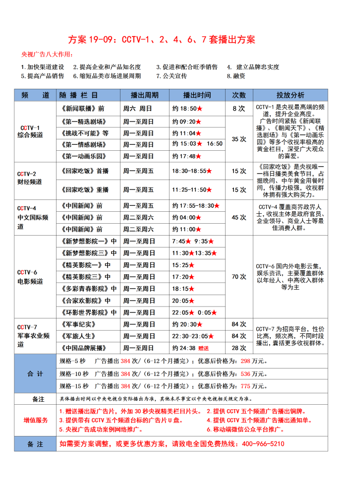 方案18-09:CCTV-1、2、4、6、7套播出方案【希望国际广告】央视一级金牌代理公司,集中央台各频道优势资源。详情致电:138-1030-5587 400-966-5210