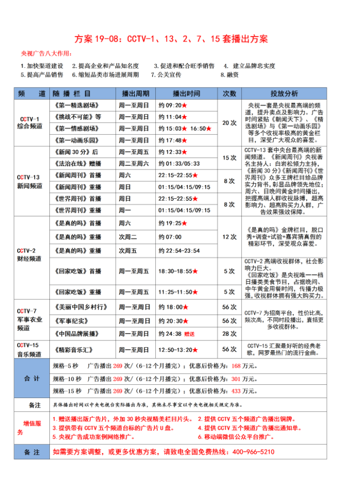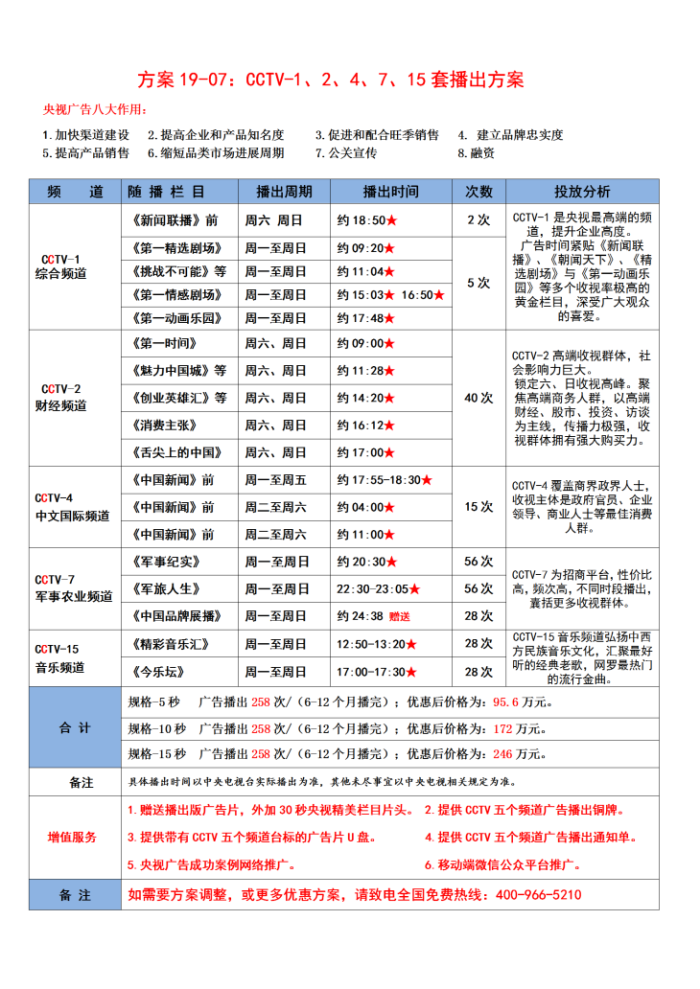 方案18-07:CCTV-1、3、4、7、15套播出方案【希望国际广告】央视一级金牌代理公司,集中央台各频道优势资源。详情致电:138-1030-5587 400-966-5210
