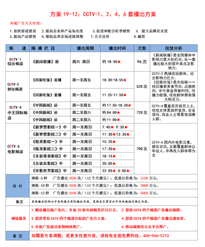 方案18-12:CCTV-1、2、7、10套播出方案【希望国际广告】央视一级金牌代理公司,集中央台各频道优势资源。详情致电:138-1030-5587 400-966-5210