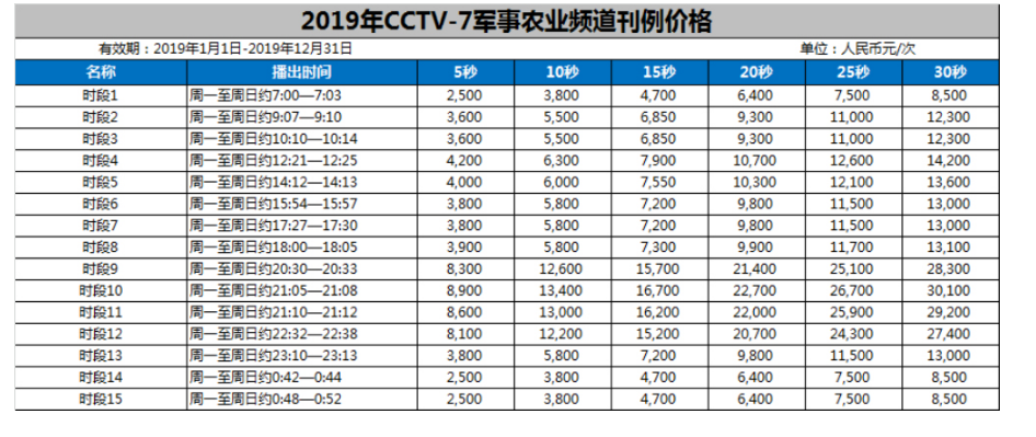2019年CCTV-7军事农业广告价格表